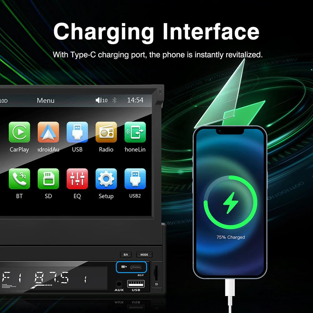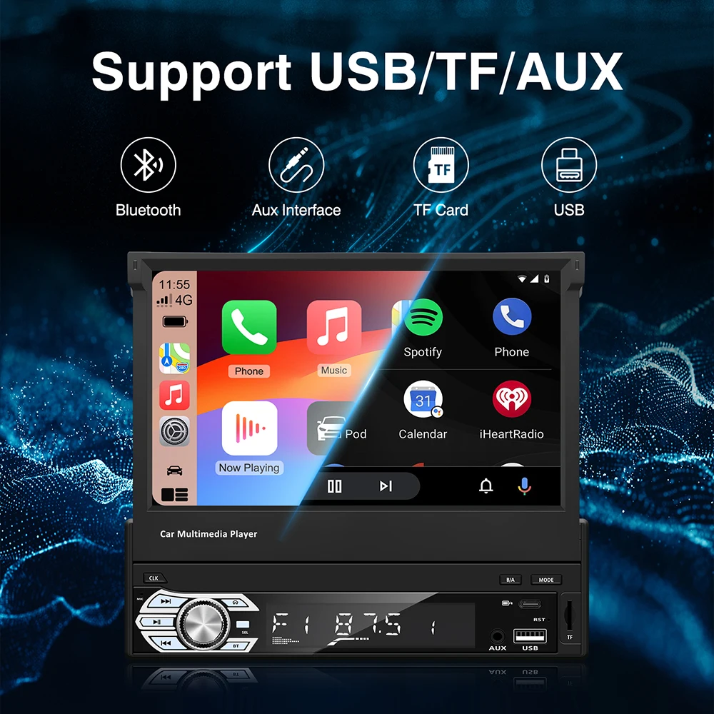 Carplay Android Auto Universal 1 Din MP5 Player 7 Inch Retractable Touch Screen Car Player HD FM AUX Input BT Radio Mirror Link